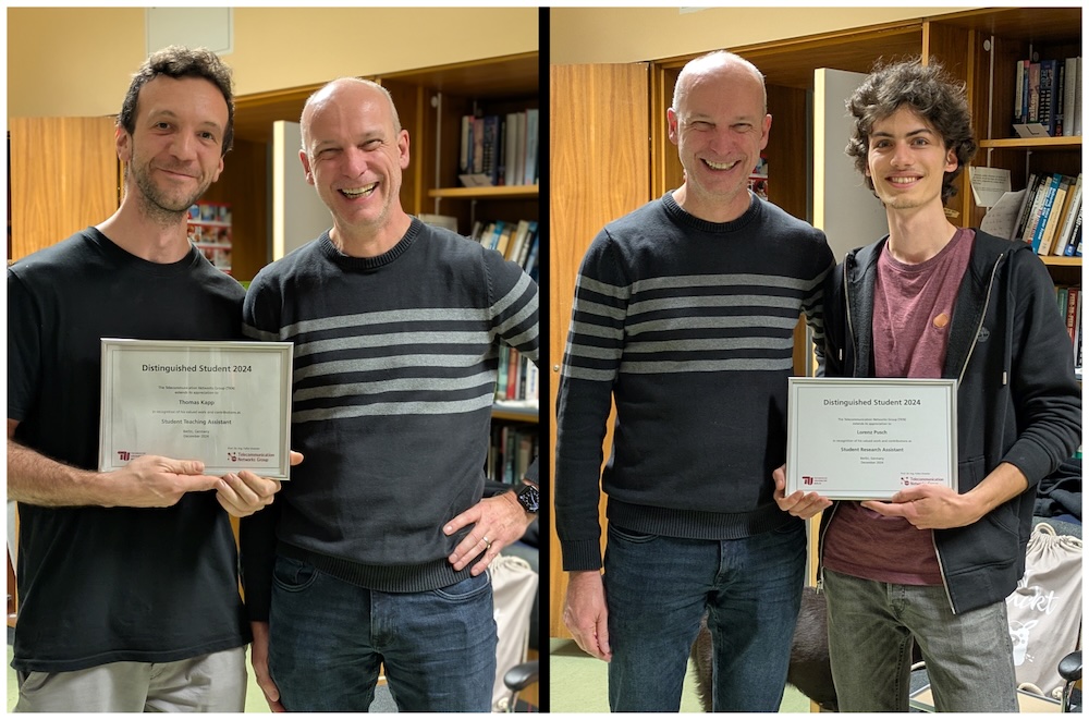 The TKN team received multiple awards for best bachelor and master theses from the German GI/ITG SIG on Communication and Distributed Systems. In addition, team members gave highlight talks on hot topics in networking and communications at NetSys 2025. Rebecca C. Pampu received a best thesis award for her Bachelor thesis Identification of the Signal Source among Multiple Simultaneous Senders in an Air-based Molecular Communication Channel. Isabel von Stebut received a best thesis award for her Bachelor thesis Resilience through Cross-Technology-Communication. Lisa Y. Debus received a best thesis award for her Master thesis Decoding Media Modulation Sharply: A Reinforcement Learning-based Receiver. Youming Tao presented a highlights talk of our recent paper Communication Efficient and Provable Federated Unlearning. Anatolij Zubow presented a highlights talk of our recent paper Hybrid-Fidelity: Utilizing IEEE 802.11 MIMO for Practical Aggregation of LiFi and WiFi.Best Paper Award at ReNeSys 2025
